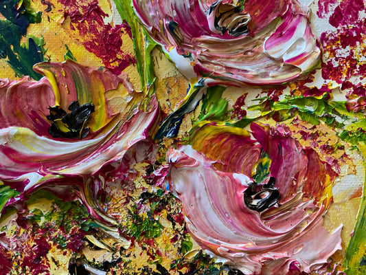 Tableau Peinture Fleurs Fond Rose - Spatule Reliefs - Toile Originale 30x60cm