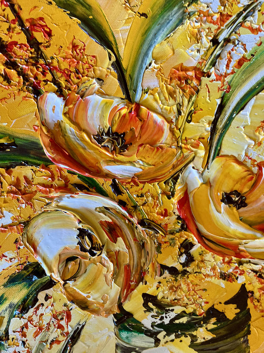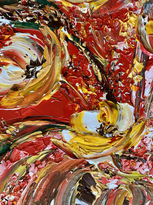 Tableau Peinture Fleurs Rouges Fond Jaune- Spatule Reliefs - Toile Originale 30x60cm