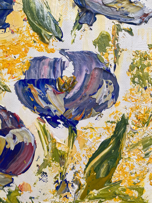 Tableau Peinture Fleurs Bleues Violettes - Spatule Reliefs - Toile Originale 30x60cm