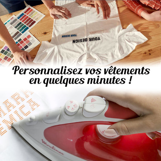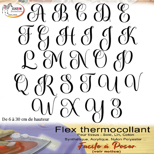 Motifs, mots, phrases personnalisées en Flex thermocollant. Il adhère facilement à tous types de textile : coton, polyester, acrylique, mélange coton/polyester sans traitement déperlant ainsi que le nylon et autres polyamides. S'applique rapidement et facilement à l'aide d'un fer à repasser ou d'une presse à chaud. Ultrafin, très confortable, vous ne le sentirez pas ....