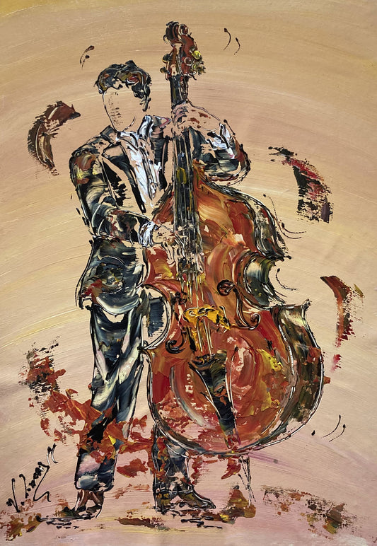 Tableau Peinture Contrebassiste Jazz - Spatule Reliefs - Toile Originale 50x70cm