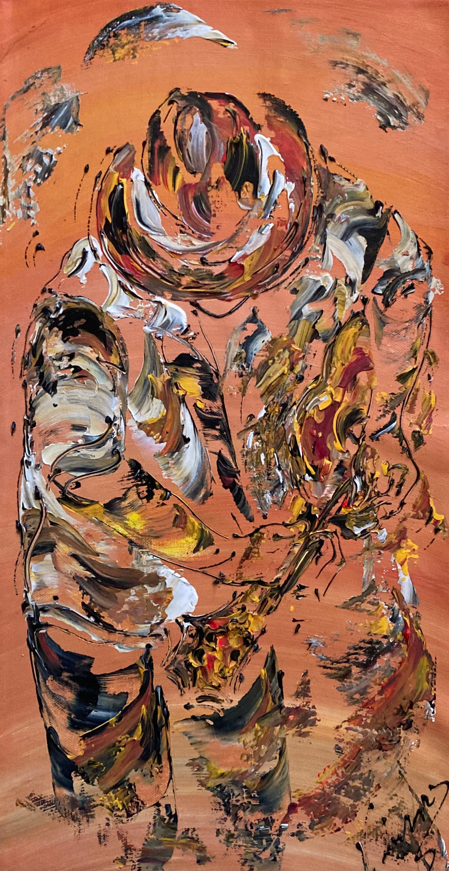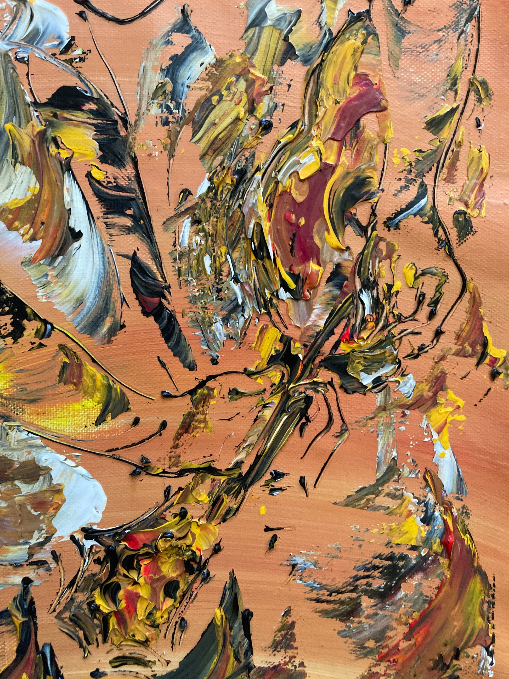 Chaque coup de spatule raconte l'histoire de ce musicien passionné. Les reliefs de la peinture acrylique donnent vie et profondeur à la scène, créant des jeux d'ombres et de lumières fascinants. Les couleurs chaudes et vibrantes, la texture de la matière... tout concourt à faire vivre cette scène sous vos yeux. Une création qui capture l'âme de la musique et la passion du guitariste.