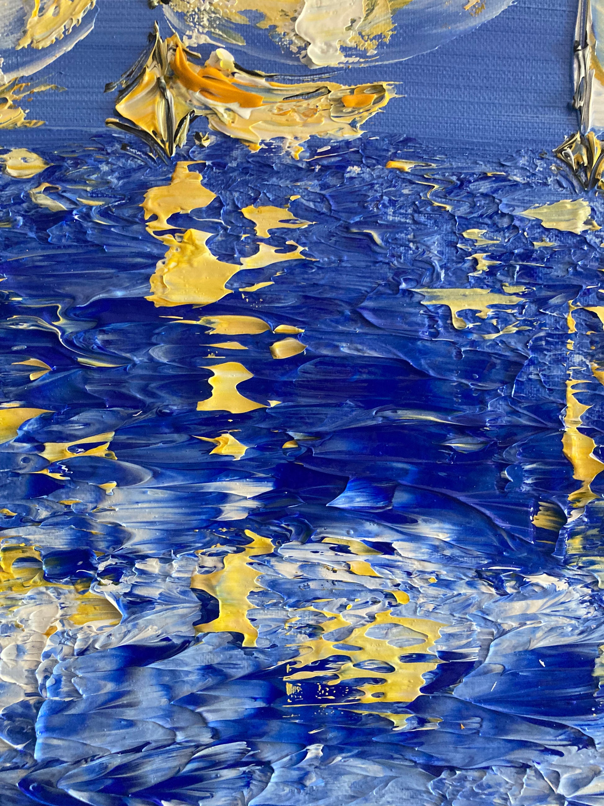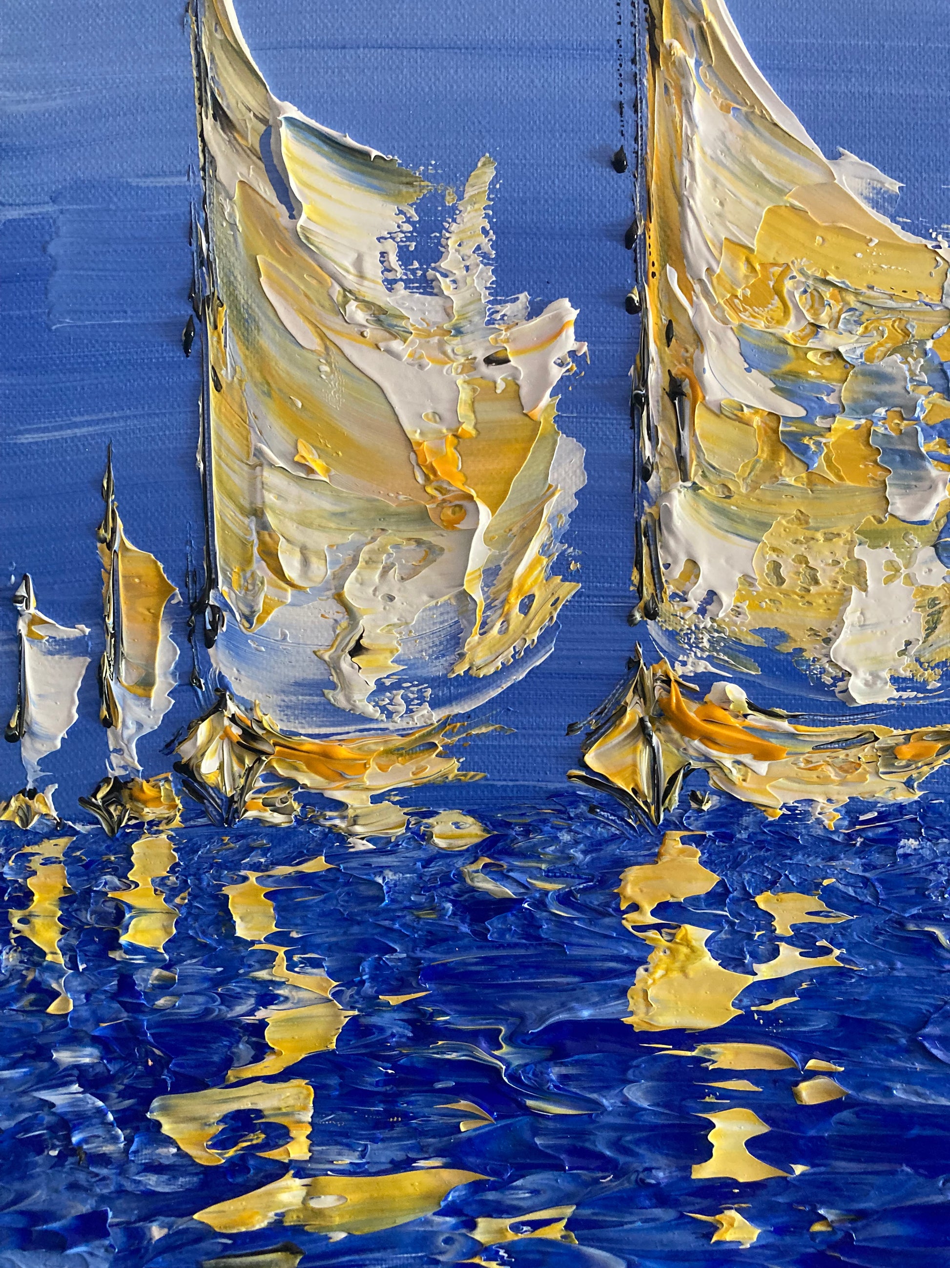 Chaque coup de spatule raconte l'histoire de ces voiliers naviguant sur les flots. Les reliefs de la peinture acrylique donnent vie et profondeur à la scène, créant des jeux d'ombres et de lumières fascinants. Les couleurs chaudes et vibrantes, la texture de la matière... tout concourt à faire vivre cette scène sous vos yeux. Une création qui capture l'atmosphère apaisante de la mer et l'élégance des voiliers.